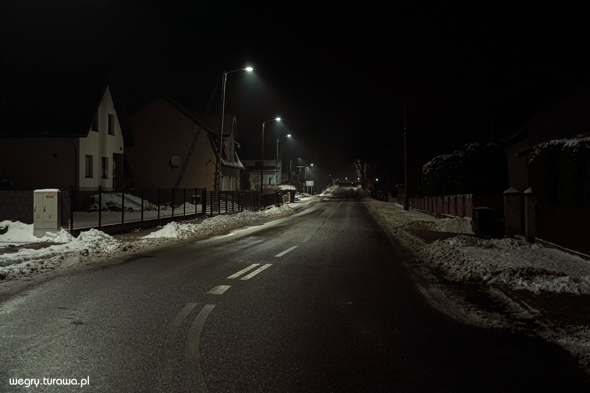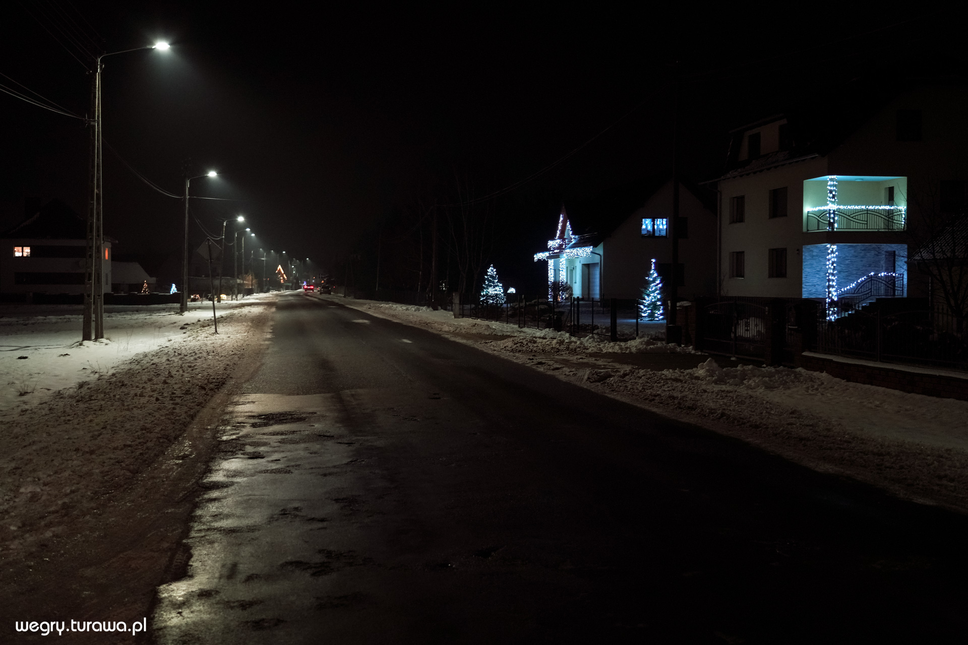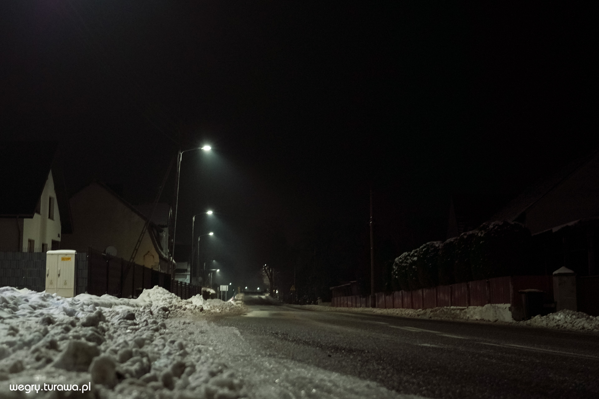 Zimowa wieczorna sceneria w Węgrach – jak z kartki świątecznej. Światło lamp odbija się w śniegu, a mróz maluje obrazy na szybach.