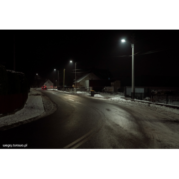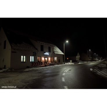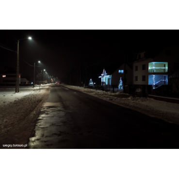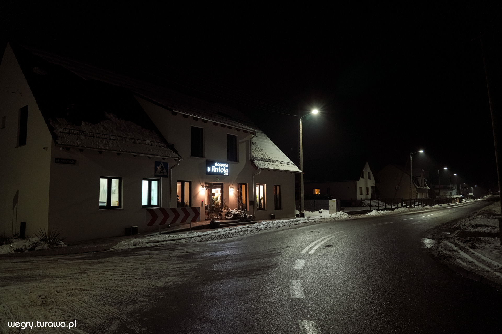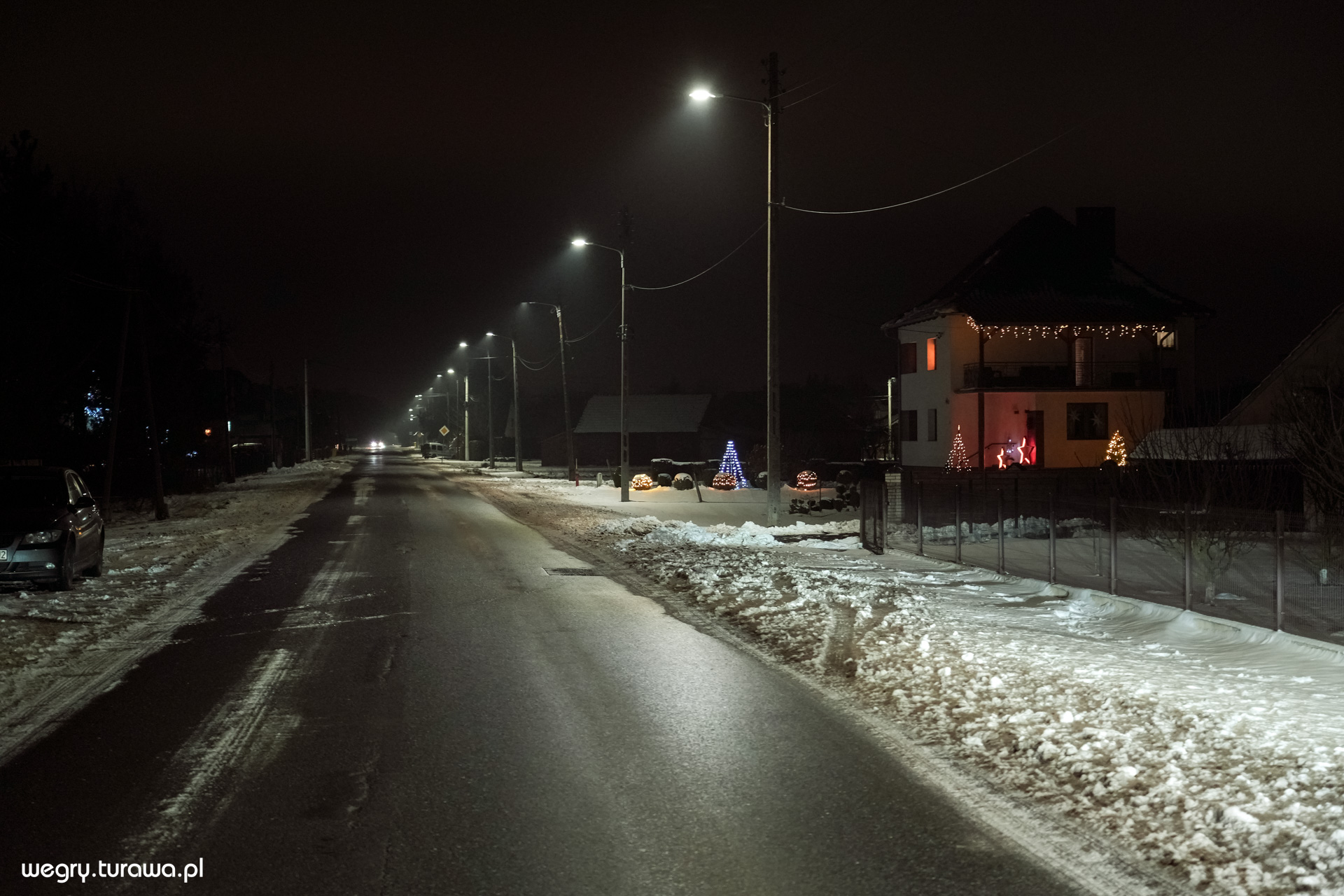 Zimowa wieczorna sceneria w Węgrach – jak z kartki świątecznej. Światło lamp odbija się w śniegu, a mróz maluje obrazy na szybach.