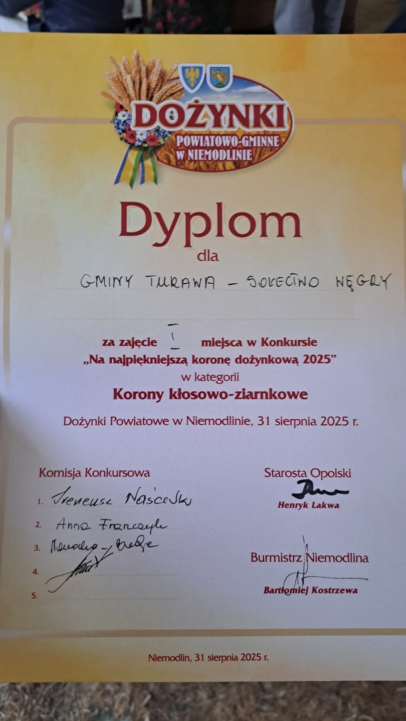 W tym roku grupa Pań z naszej miejscowości przygotowała nową, przepiękną koronę dożynkową. Jej kunszt i staranność zostały docenione – zdobyła I miejsce na dożynkach powiatowo-gminnych w Niemodlinie! Gratulujemy i dziękujemy za wspaniałą reprezentację naszej społeczności.