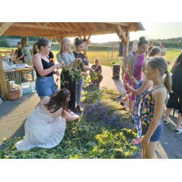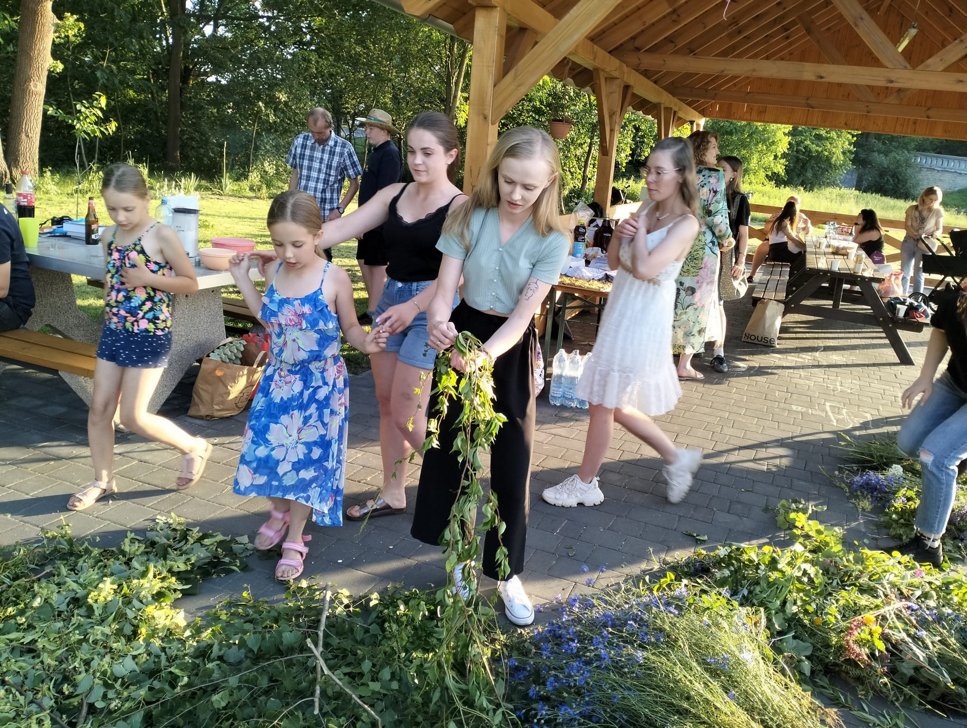 Wieczór pełen magii rozpoczął się od wspólnego plecenia barwnych, pachnących wianków. Później, przy ognisku, uczestnicy częstowali się kiełbaskami, tradycyjnymi słowiańskimi podpłomykami oraz suricą – potrawami, które idealnie dopełniły atmosferę tego święta.