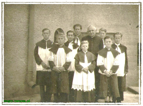 "Przesylam zdjecie z r.1951(? ); Proboszcz Kulik w otoczeniu nas ministrantów. Przed księdzem stoi śp. Karol Bunke,który potem był do końca swojej tragicznej śmierci kościelnym. Pierwszy od prawej stoi śp.Paweł Buchta opiekun piłkarzy w Osowcu. Obaj są znani w Osowcu-inne osoby też znam".