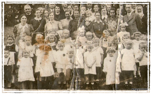 "Przesylam zdjecie z roku 1940(?) przedstawiajace przedszkole katolickie pod opieka proboszcza Kulika i kierowniczki Pani Lasek (stoi przed ksiedzem).Mam nadzieje,ze stoja tam osoby znajome i zyjace do dzisiaj (ja stoje w 1 rzedzie na srodku)".