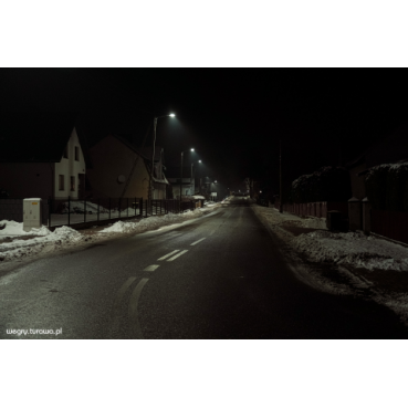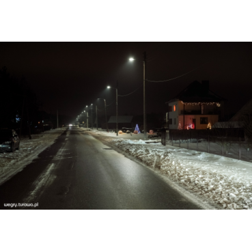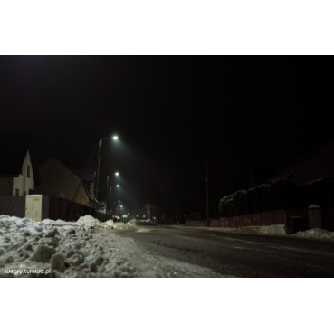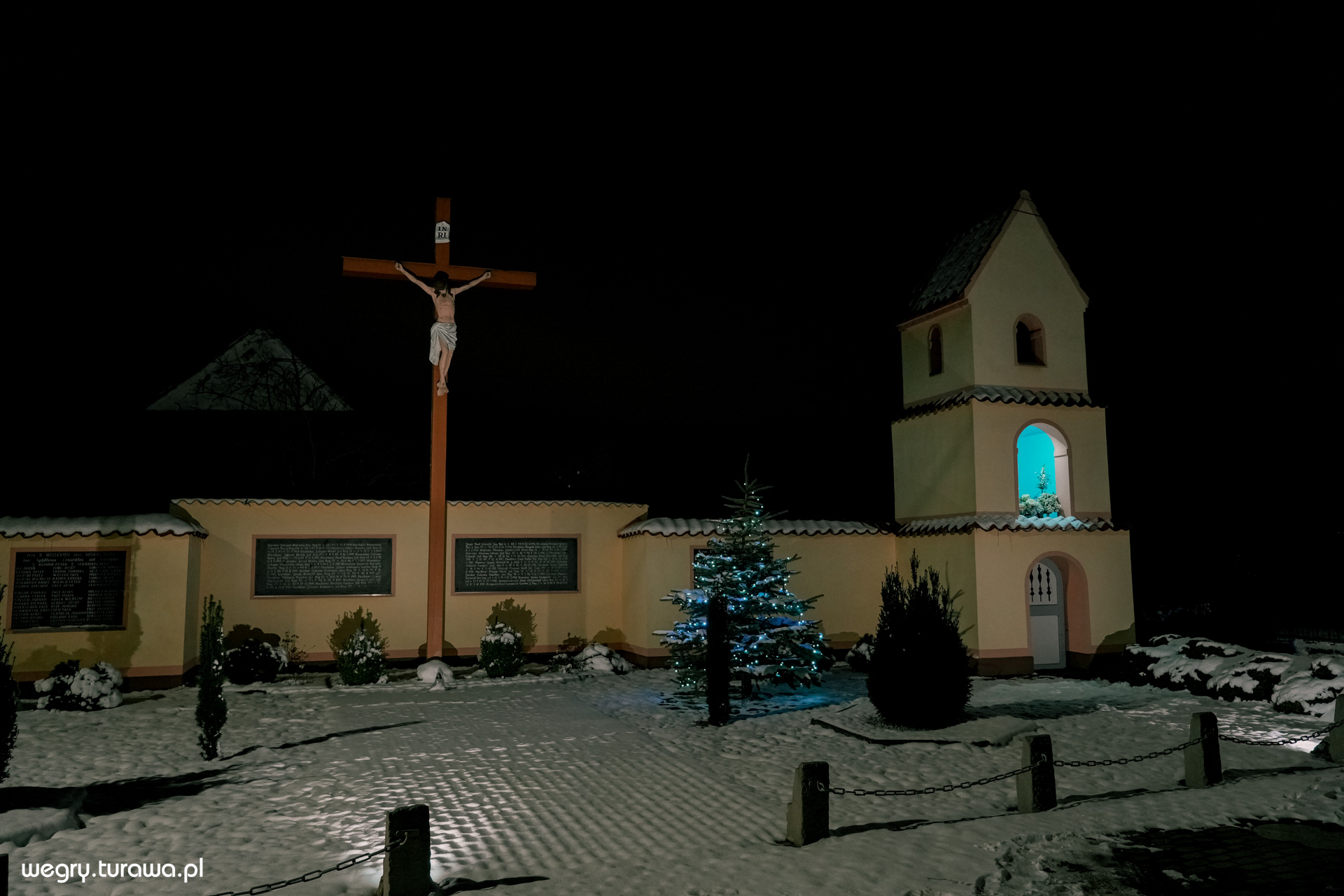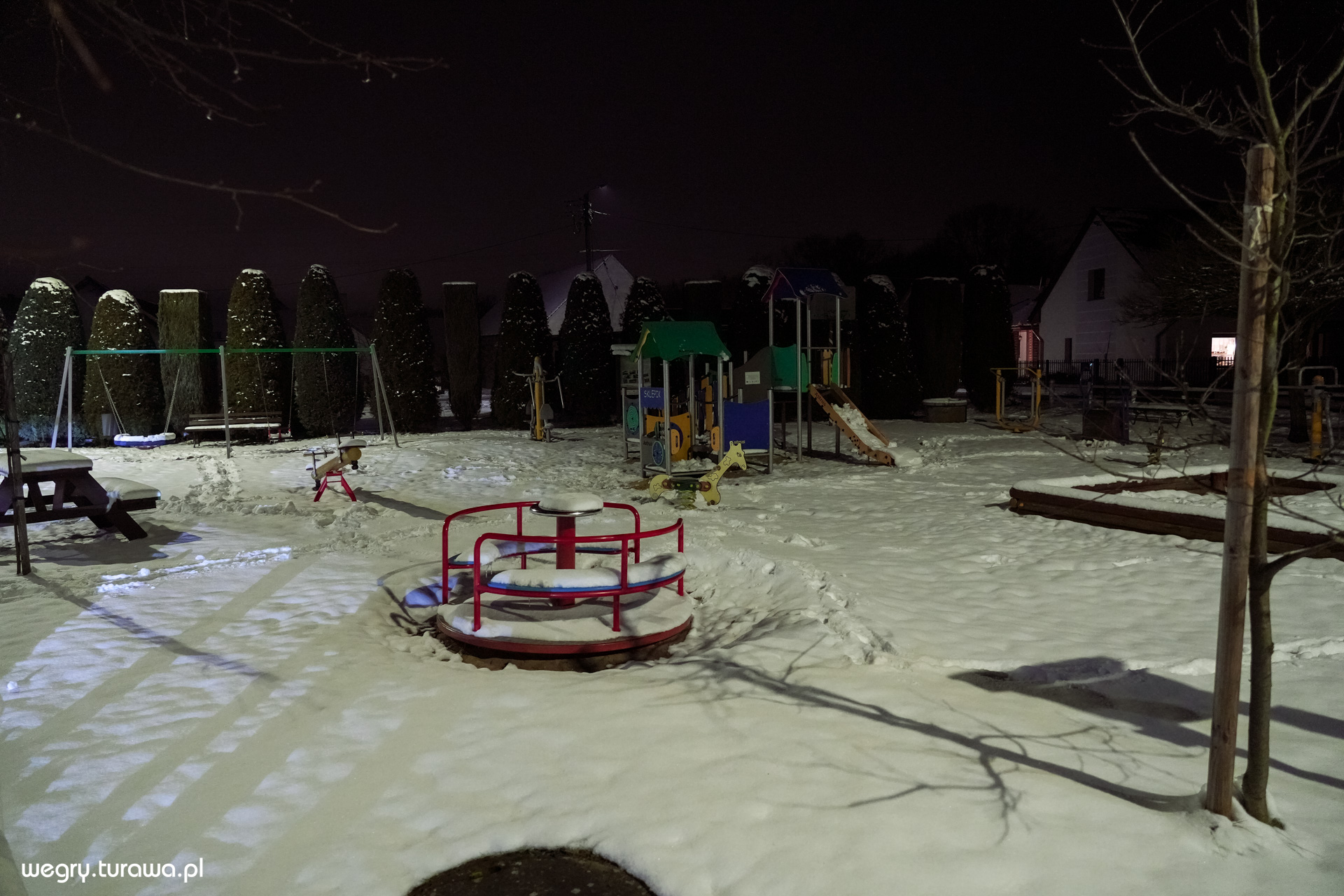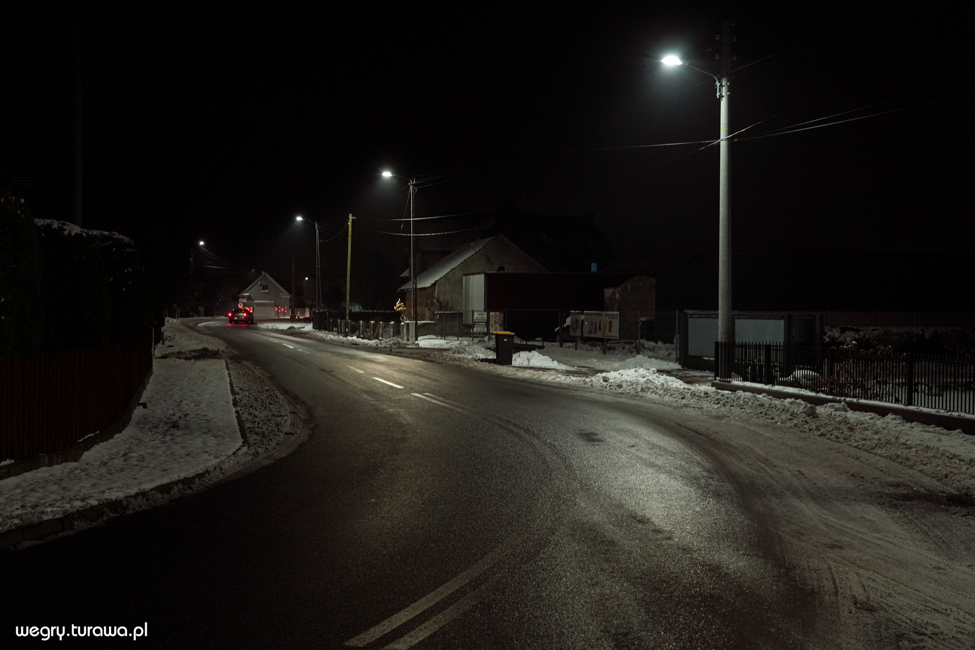 Zimowa wieczorna sceneria w Węgrach – jak z kartki świątecznej. Światło lamp odbija się w śniegu, a mróz maluje obrazy na szybach.