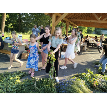Wieczór pełen magii rozpoczął się od wspólnego plecenia barwnych, pachnących wianków. Później, przy ognisku, uczestnicy częstowali się kiełbaskami, tradycyjnymi słowiańskimi podpłomykami oraz suricą – potrawami, które idealnie dopełniły atmosferę tego święta.